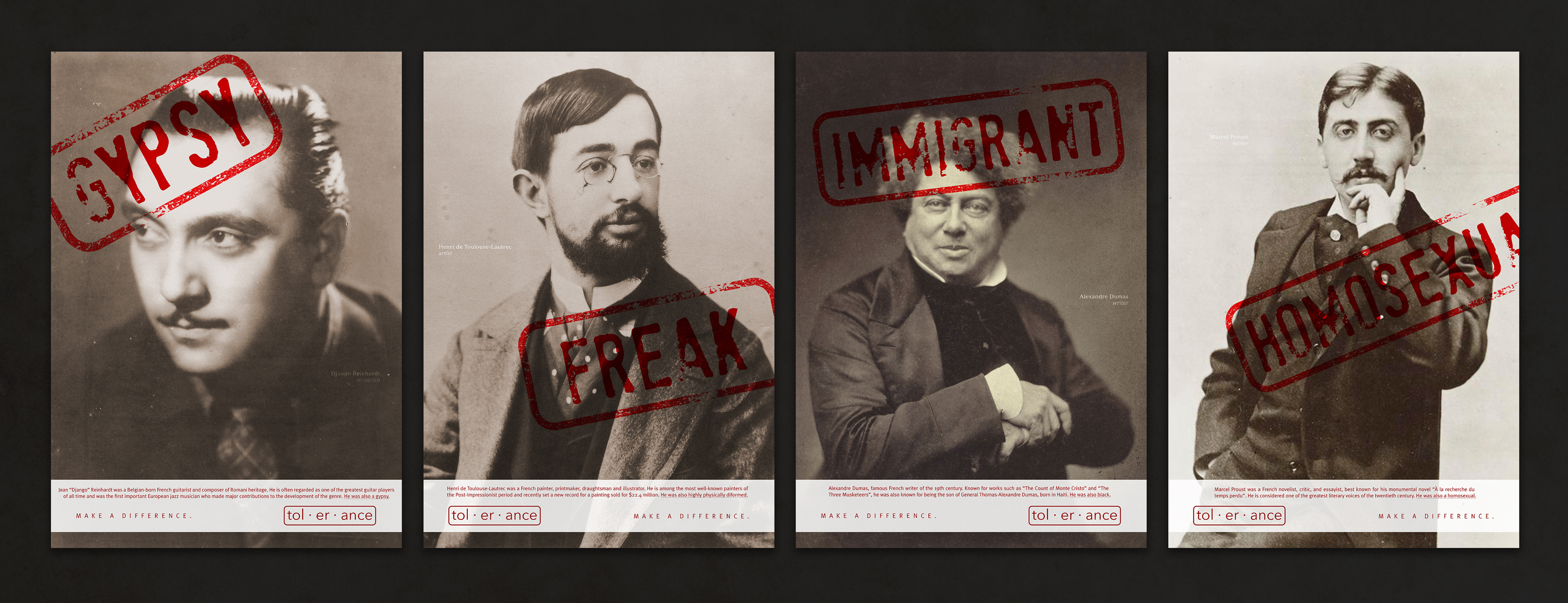 Advertising campaign for a fictional Non-Governmental Organisation that promotes tolerance through the usage of famous French personalities who were labeled by society for being "different".
